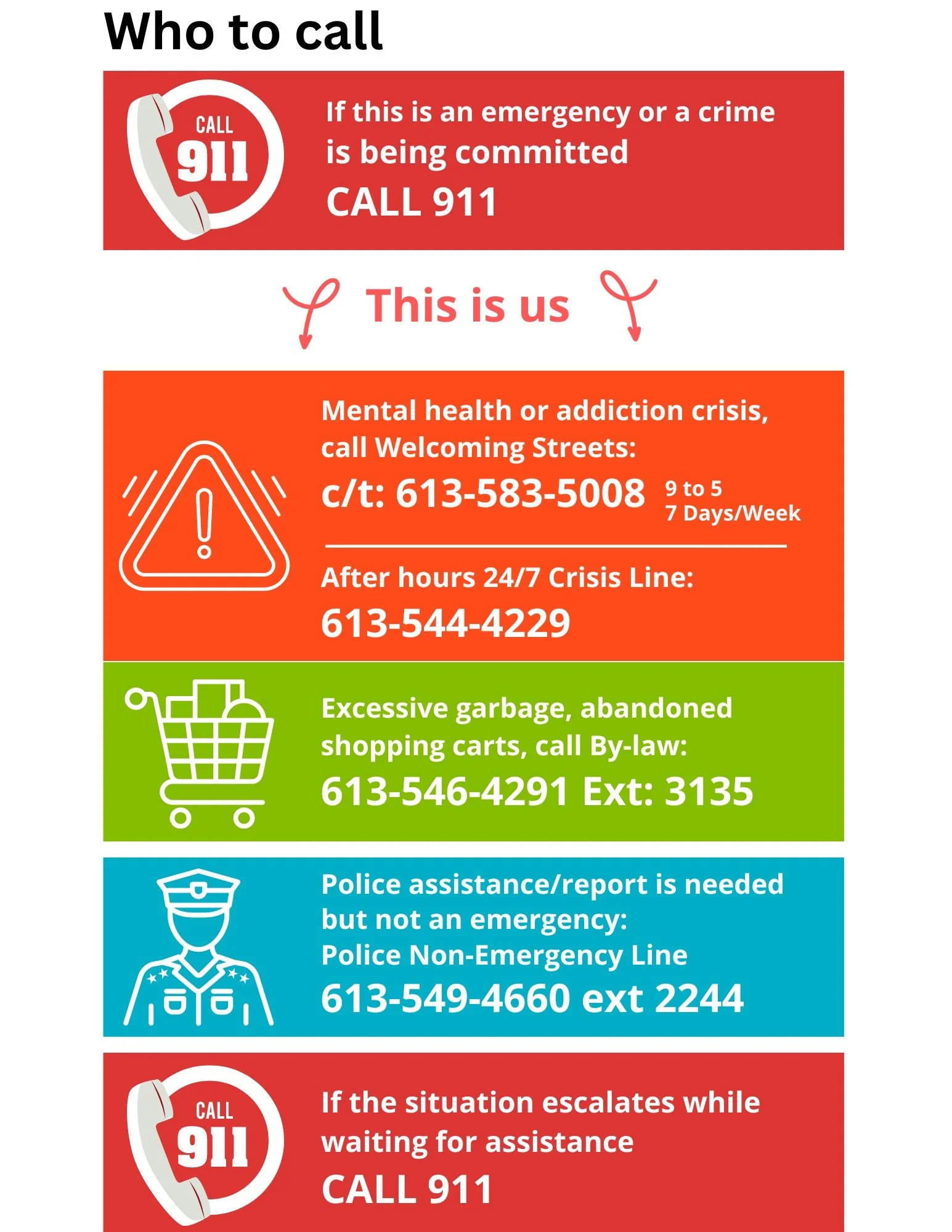 Display the 'Who to Call' poster in a visible area for your staff. If you need one, contact welcome@downtownkingston.ca, and we'll deliver it to your business. You can also click on the poster image for a print version.