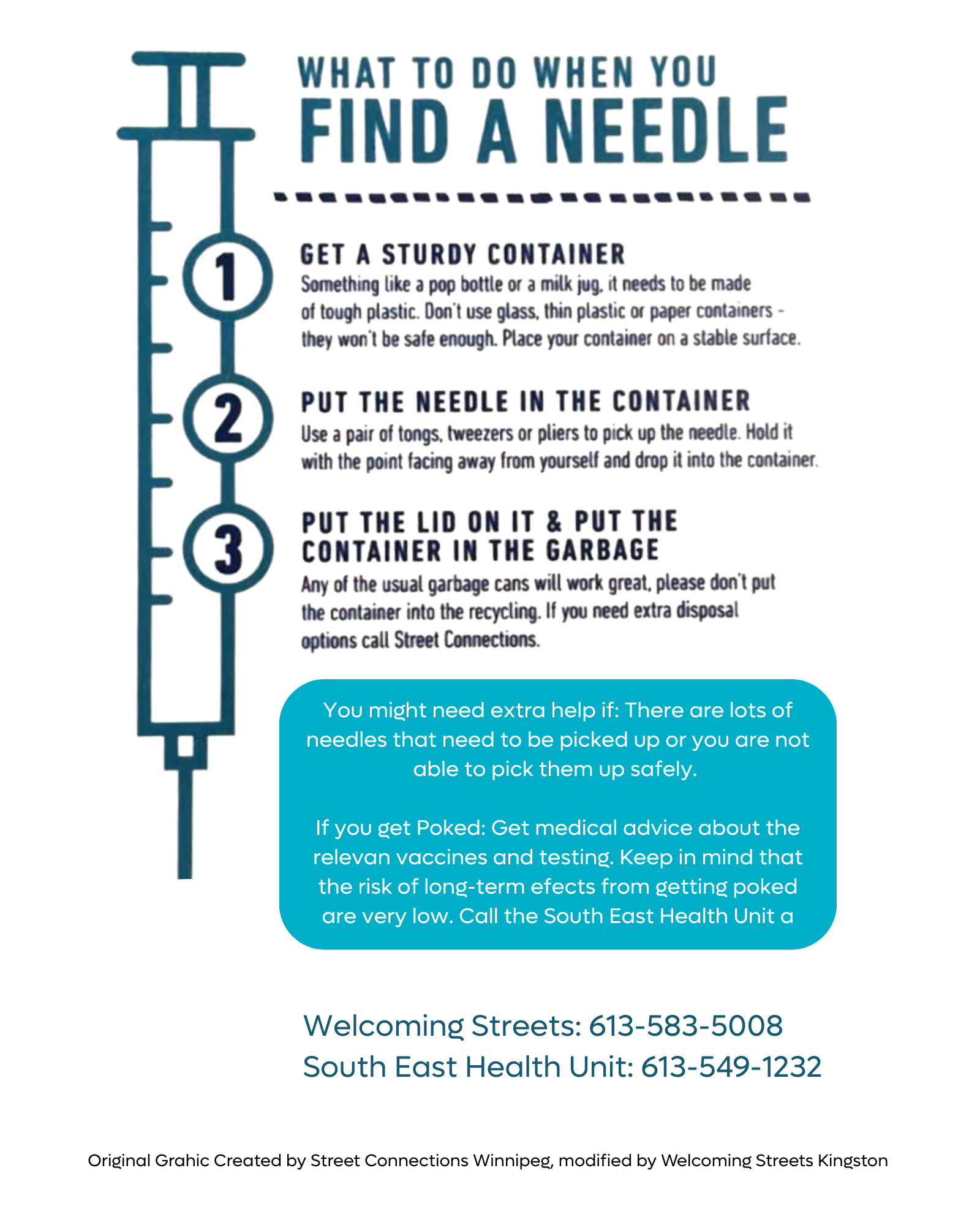 If you find a needle, syringe, or other drug paraphernalia on private property, it is the responsibility of the property owner, landlord or business owner to pick up and dispose of the needle. Contact Welcoming Streets at 613-583-5008 for support in ensuring safe disposal practices.